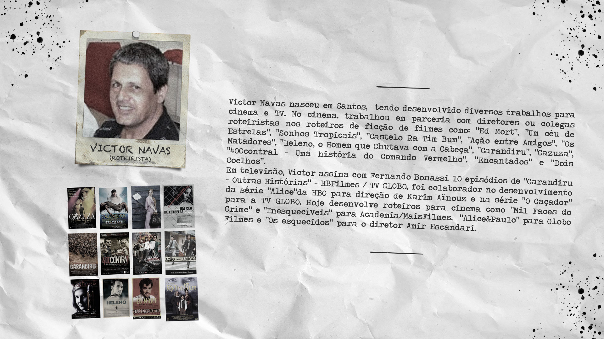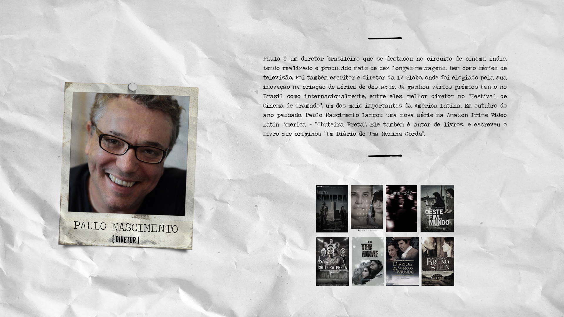 Com vasta experiência em contar histórias, conta no seu currículo com 8 longas metragem documentais que marcaram presença e arrecadaram prémios em festivais e mostras à volta do mundo, bem como em emissoras de tv e com parceiros globalmente conhecidas como BBC, Globo Filmes, Netflix, GloboNews, Canal OFF, Sportv, TV Futura, Artel, «Globosat, entre outros.